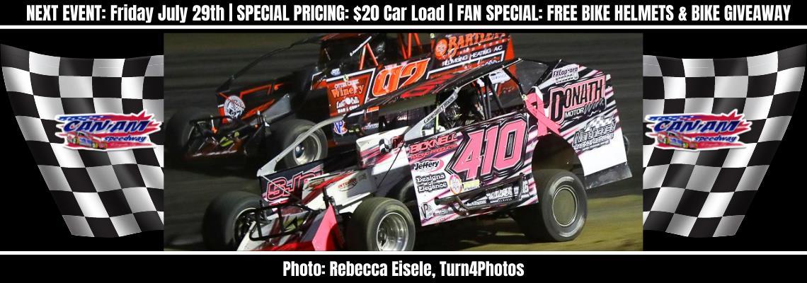 LA FARGEVILLE, NY – One of the fan favorite nights at Can-Am Speedway during the season is Carload Night! Bring the whole carload of your crew for one special general admission price to the grandstands – just $20! Load up the whole posse and head out to the Nasty Track of the North Friday night, sponsored by FABCO Building Components and Child Advocacy Center (CAC) and Victims Assistance Center (VAC) of Jefferson, Lewis, & St. Lawrence County. Single admissions are still available for the regular grandstand price as well. Additionally, the Child Advocacy Center (CAC) and Victims Assistance Center (VAC) will be at the track giving away new bike helmets to the first 250 youth through the General Admission Gate and drivers, race teams, and local businesses have sponsored a bike giveaway. There is no cost to enter, just hold onto your ticket and winners will be drawn during intermission!