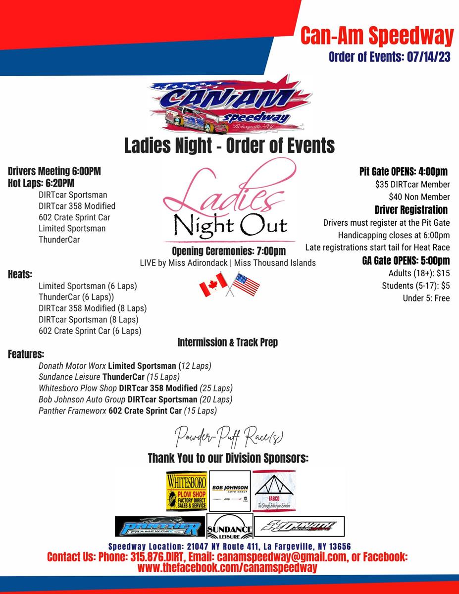 Spectator gates open at 5pm racing starts at 7pm, with opening ceremonies and National Anthems by Miss Thousand Islands and Miss Adirondak.