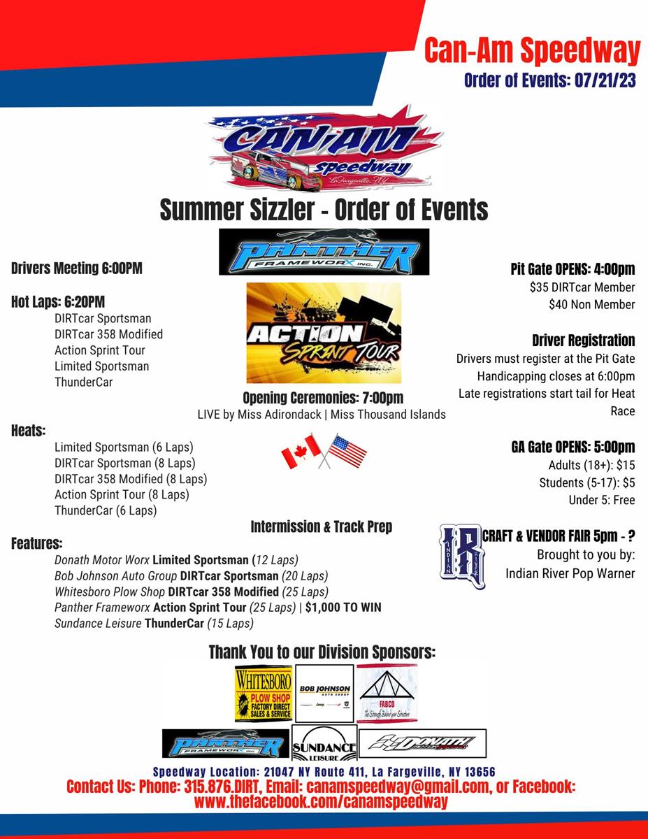 Spectator gates open at 5pm with the green flag dropping at 7pm. Opening ceremonies and National Anthems will take place featuring Miss Thousand Islands and Miss Adirondak.