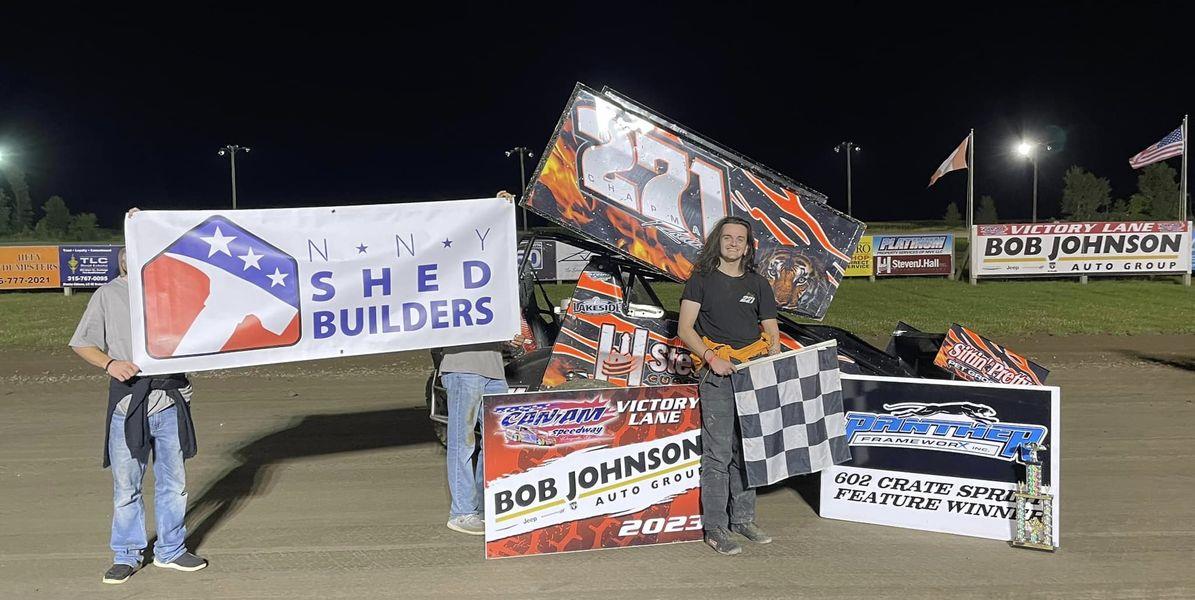 The DIRTCar Sportsman North Regional Series was on hand with 29 drivers read for a 30 lap contest, featuring invaders and our own locals in the Bob Johnson Auto Group DIRTCar Sportsman Division. The start of the race saw Eric Nier take the lead from the pole over Gavin Eisle, Kyle Devendorf, Fire Swamp and Dave Rogers. Nier was looking for his first win and held a comfortable lead in the opening laps as Eisle and Dave Rogers tried to keep pace with the Carthage native. Laps were clicking of at a quick pace and Nier was the dominant car as the race went on, even in traffic, his car was not slowed at all as Eisle and Rogers, were hoping for a yellow flag to get a chance at the leader. On lap 17, that’s just what they got, as Steve Roberts slowed off turn four and the yellow flew. The next restart was where Dave Rogers made the winning move as he jumped to the extreme inside lane for a three wide move to take the top spot away as Eisle remained in second, with Nier, Mike Fowler and Kyle Devendorf still fifth. From there Dave Rogers put it on auto pilot, pulling away to a big lead with Gavin Eisle second and Mike Fowler making it to the top three in the closing laps. After a big move on the restart and saving his best for the end, Dave Rogers made it pay off as he dominated the final 13 laps to secure his second win on the season at Can Am, third career points paying series win and 5th overall counting his two World Short Track Championships in Charlotte. Gavin Eisle crossed a solid second over Mike Fowler, Tyler Corcoran and Jessica Power.