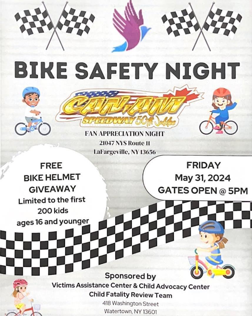 Tonight is FAN APPRECIATION NIGHT +Bike Night! The Can-Am Speedway Officials have discounted all General Admission and we look forward to treating YOU to a great "Night at the Races"! The Victims Assistance Center will also be on hand to provide the first 200 youth with a FREE Bike Helmet. Drivers have also generously donated BIG for the intermission bike drawing. 30+ youth are expected to leave tonights program with a NEW summer wheels (bike, scooter, big wheels, etc)!