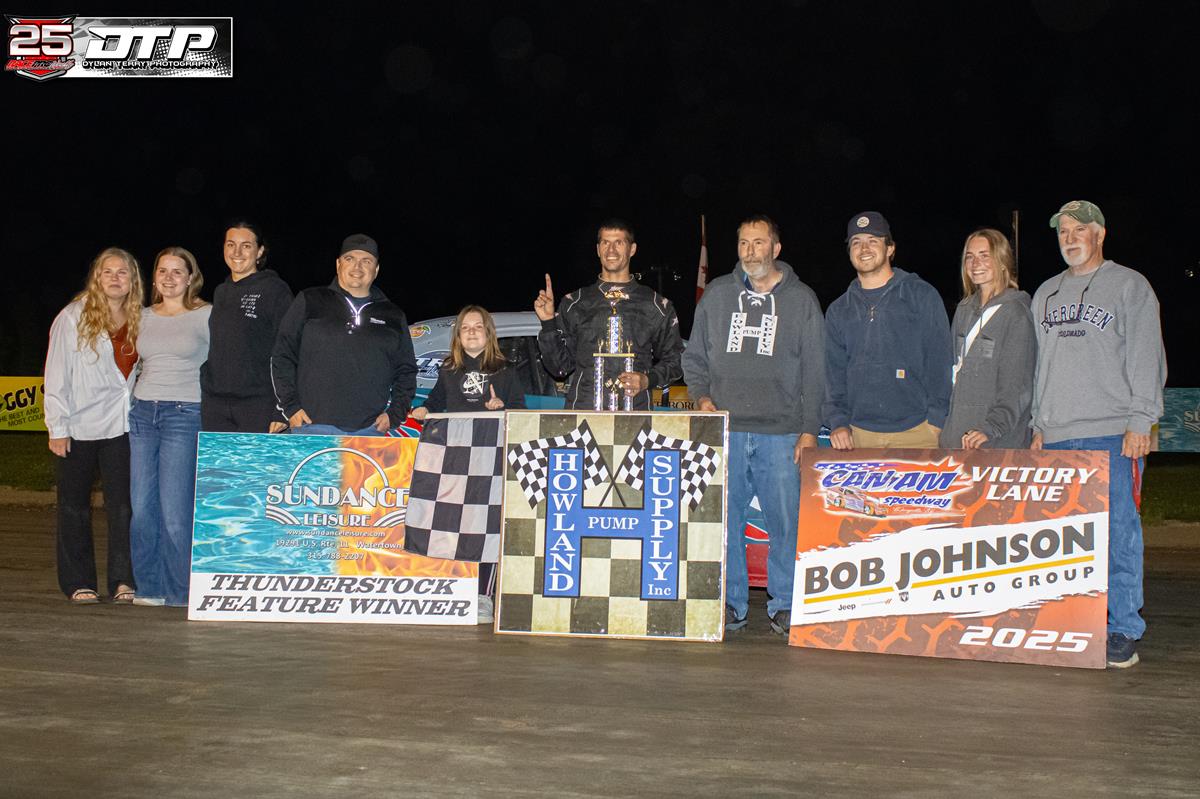 Tony Frezzo has been running strong as of late and on this night he jumped from third to the lead at the start of the 15 lap Sundance Leisure Thundercar feature event over David Rasmussen and Corey Valade. Frezzo looked strong but Valade was on the move, charging to the lead on lap 5 as he pursued his third win of the year. Several cautions for minor spins slowed the race on many occasions, however Valade remained up front and in control. On a late restart Valade was able to hold off all challengers to score his third win of 2025 and extend his points lead. David Rasmussen charged to 2nd with Francis White coming from 13th to finish third, while Mike Greenfield and Jared Gilson completed the top 5.